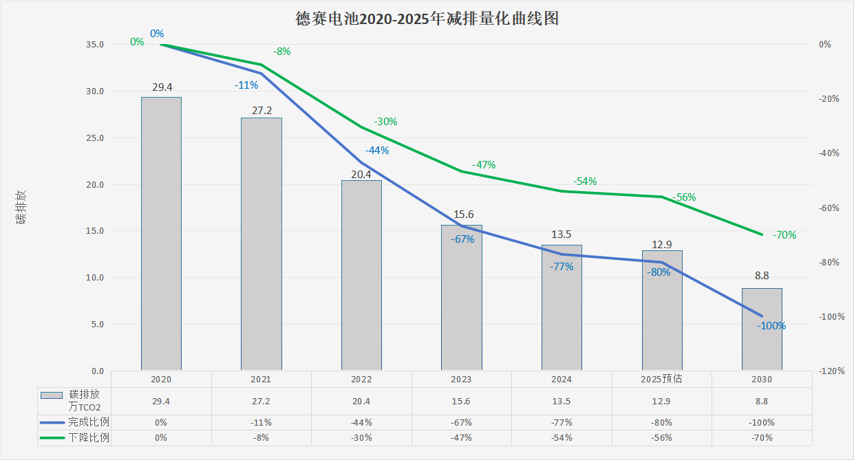 2022年德賽電池(惠南工業園)的范圍1、2、3碳排放總量約為11.3萬噸,德賽電池通過不懈努力,僅至2024年,公司已成功將碳排放總量削減至約5.0萬噸(已完成80%的目標),實現相對于基準年碳排放總量56%的顯著減排,2025年預計碳排總量約為4.7萬噸(預計完成83%的目標),實現相對