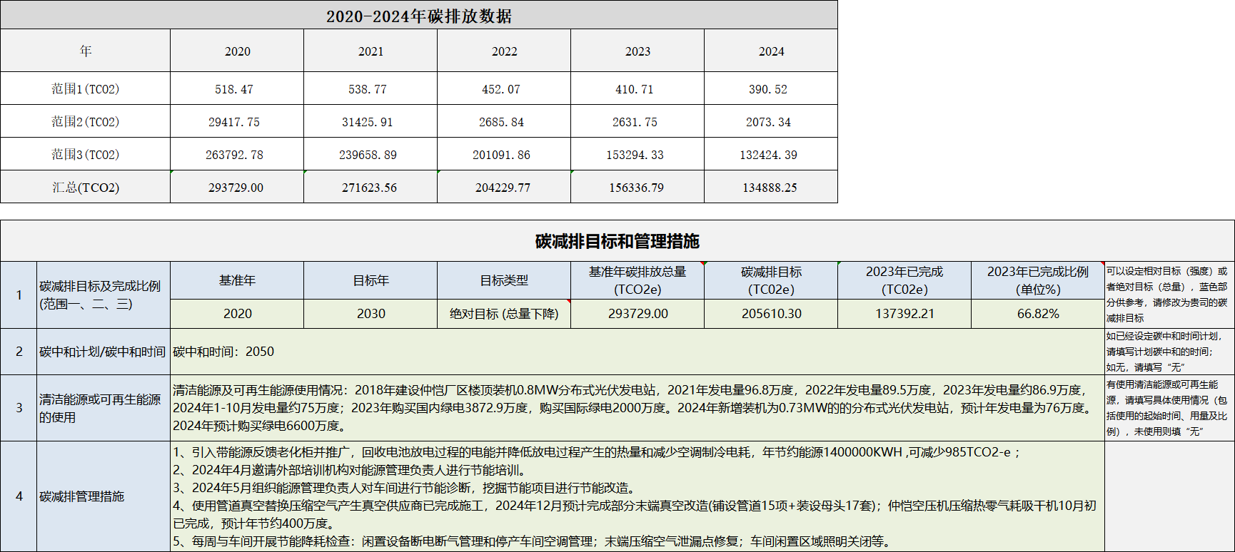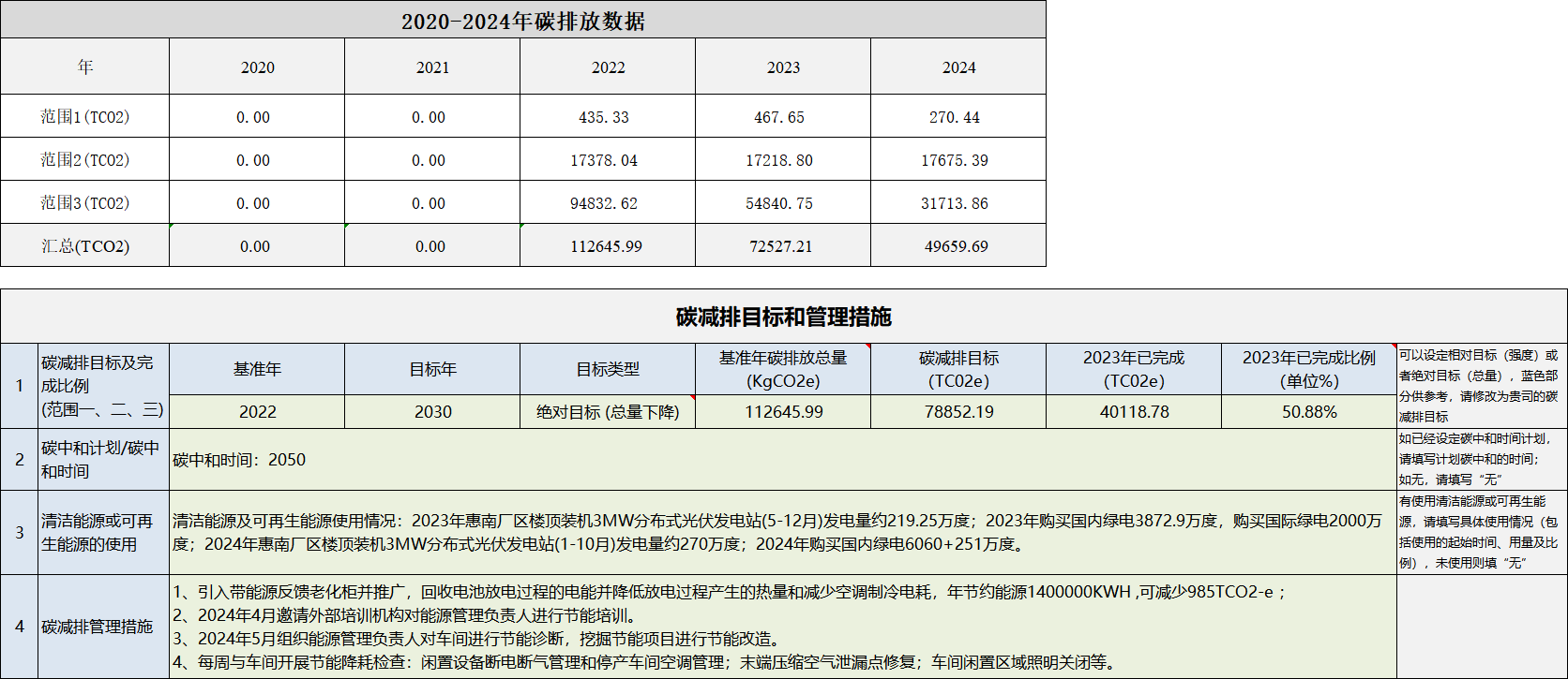 鑒于清潔能源與可再生能源對于實現碳減排目標的關鍵作用,德賽電池在其運營中顯著增加了這類能源的利用。公司不僅建成了4.53MW的園區光伏電站,還大幅提高了可再生能源(經綠色電力證書認證的電量)的使用比例,2024年使用的可再生能源電量高達5987萬多度,占仲愷總用電量的94%,2024年9月新建成裝機功率為0.73MW的樓頂分布式光伏電站,顯著降低了運營過程中的碳排放。此外,德賽電池通過實施真空技術改造及嚴格的節能降耗檢查審核機制,顯著提升了能源利用效率,有效遏制了能源浪費現象,有力推動了碳減排目標的實現。值得一提的是,德賽電池于2024年5月新建成了裝機容量為13.4MWh的儲能電站,儲能電站通過削峰填谷機制,對電網的穩定運行發揮著實質性的積極作用。電網運行的穩定性增強,直接提升了電能質量,使得電能傳輸效率得以提高,同時減少了傳輸過程中的損耗。這一系列正面效應,間接地促進了社會整體的碳排放減少,為環境保護貢獻力量。
